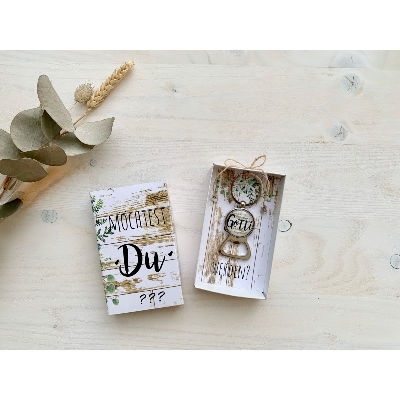 Flaschenöffner als Schlüsselanhänger mit Schlüsselring und Glas-Cabochon in Geschenkschachtel mit der Frage „Möchtisch Du Götti werde?“