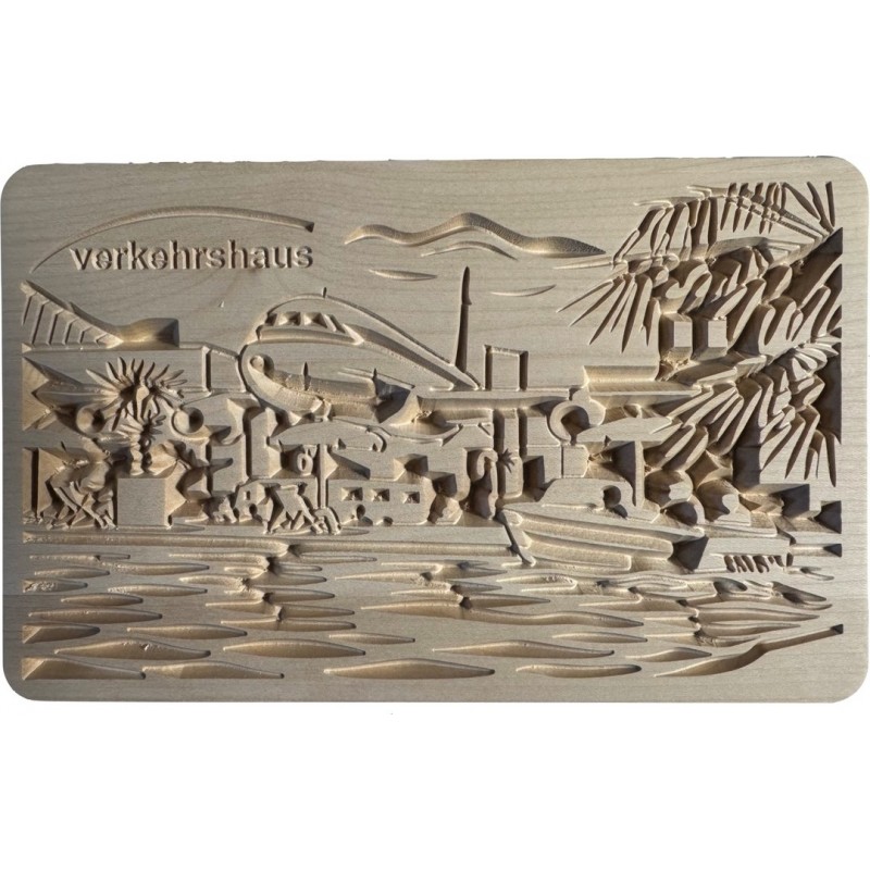 3D Schneidebrett VERKEHRSHAUS Luzern geschnitzt Bergahorn 240x150x11mm. Grösse: 15x24x1 cm FSC Herkunft Schweiz mit Zertifikat. Oben und unten gerundet und Ecken abgerundet.