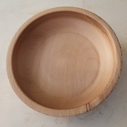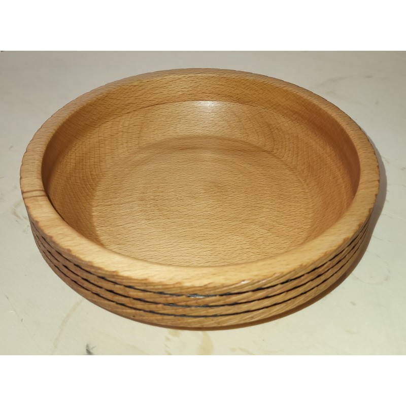 Plat tourné en bois de hêtre, rond, avec décoration extérieure incrustée. Diamètre extérieur 210mm, intérieur 190mm, hauteur 65mm, profondeur 45mm.