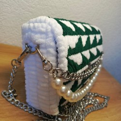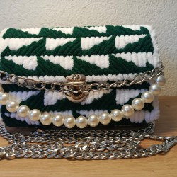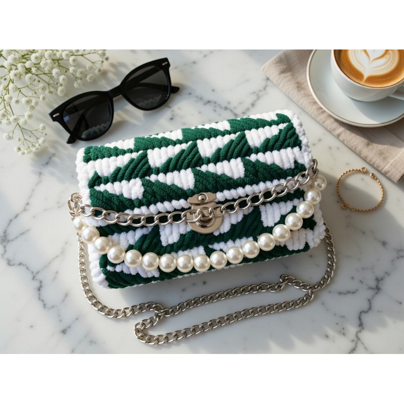 Le sac Rookia associe un tissage vert profond et blanc dans un motif géométrique unique, sublimé par une élégante chaîne et des perles raffinées. Un modèle audacieux et sophistiqué qui attire les regards et apporte une touche d’originalité à vos tenues. - Dimensions : 20 × 13 × 5 cm – compact mais spacieux pour emporter vos indispensables avec style.
