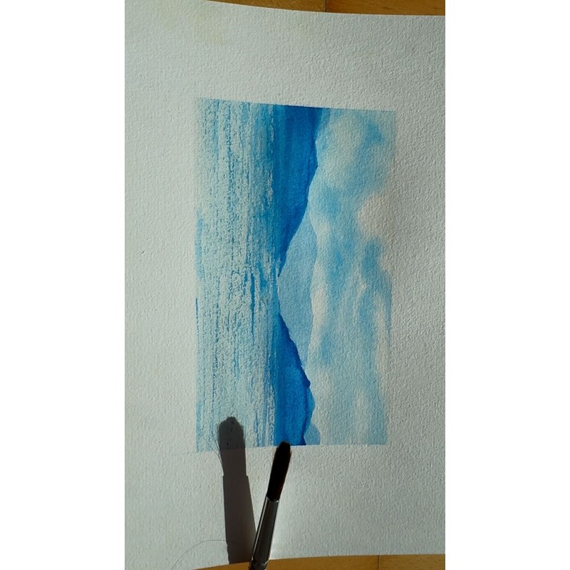 Paysage peint en aquarelle représentant le lac en premier plan et des des montagnes en second plan, tout cela sur un ciel nuageux.