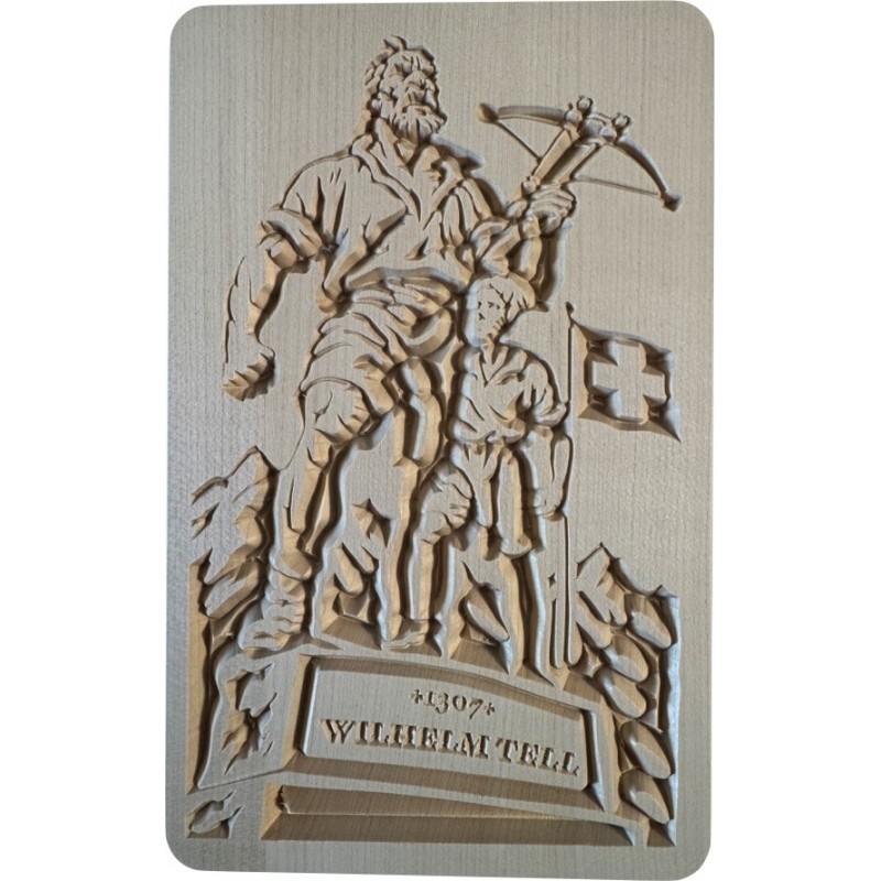 3D Schneidebrett Wilhelm Tell geschnitzt Bergahorn 240x150x11mm. Grösse: 15x24x1 cm FSC Herkunft Schweiz mit Zertifikat. Oben und unten gerundet und Ecken abgerundet.