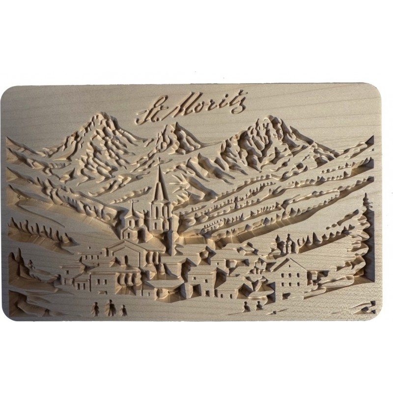 3D Schneidebrett mit Kunstwerk St. Moritz geschnitzt geschnitzt von Andres Streiff in Bergahorn 240x150x11mm oder weitere Sujets. Dieses dekorative Ahornbrett (24 x 15 cm) mit einem Kerbschnitt macht sich gut auf jedem Küchentisch. Ob als Zvieri- oder Käseplättli oder Untersetzer für Pfannen, den Tee- oder Wasserkrug,.. . Das Ahornbrettchen ist vielseitig einsetzbar und auf der unbeschnitzten Unterseite oder auf der Oberseite auch als normales Schneidebrett verwendbar. Bergahorn ist sehr hart und wird durch ein Küchenmesser nicht beschädigt. Gelaserte Brettchen gibt es auf jedem Markt. Dieses hier ist aber dreidimensional geschnitzt bis 6 mm tief. Das gibt es nur hier! Grösse: 15x24x1 cm FSC Herkunft Schweiz mit Zertifikat. Oben und unten gerundet und Ecken abgerundet wie Foto.