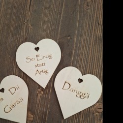 Die Herzen sind aus Schweizer Pappelholz und werden mit dem Laser beschriftet, Für den Wasserschutz und dass Sie lange daran Freude haben können, werden sie zusätzlich mit Holzwachs versiegelt.