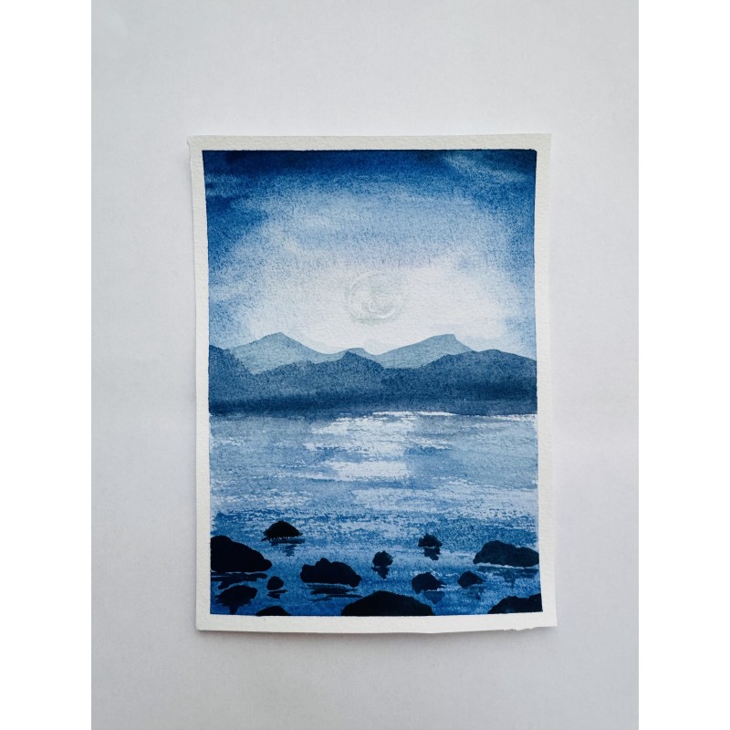 Paysage nocturne fait en aquarelle représentant un lac avec en arrière plan les montagnes surplombées de la lune. Idéal pour décorer votre chez vous. Taille : 12x16 cm