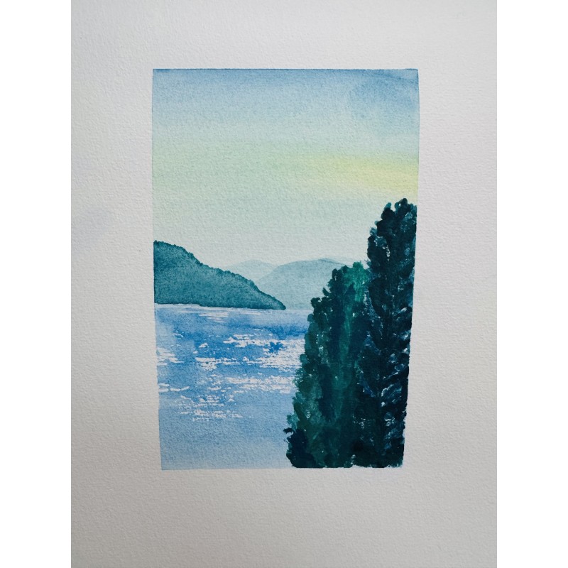 Paysage peint en aquarelle représentant le point de vue sur le lac. Idéal pour décorer votre chez vous. Taille : 10x16cm