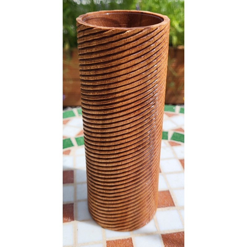 Vase en bois tourné avec un verre en polycarbonate à l'intérieur.