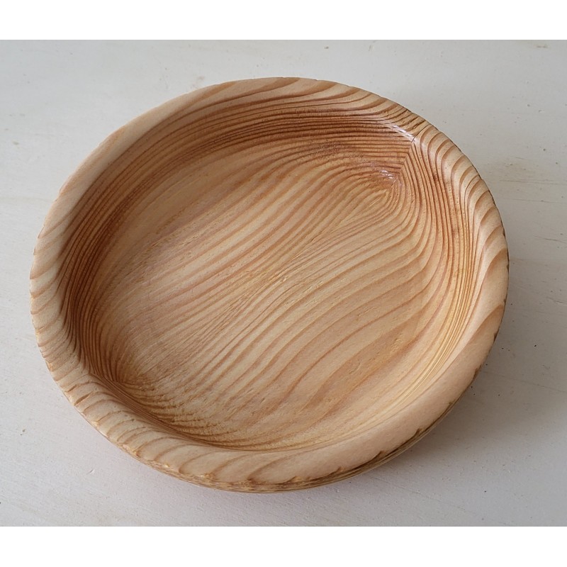 Plat en bois de mélèze, tourné rond, traîté avec de l'huile de cire. Dimensions : diamètre extérieur xxmm, diamètre intérieur xxmm, hauteur extérieure xxmm, profondeur xxmm.