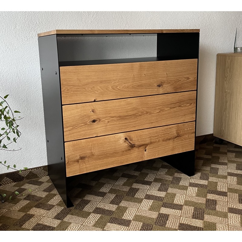 Sind Sie auf der Suche nach einem stilvollen Möbel in Schreinerqualität? Finden Sie den Gedanken einer regionalen Produktion ebenso schön? Dann könnte das vorliegende Angebot Ihren Vorstellungen entsprechen. Die Kommode wurde von einem Schreiner aus regionalem Holz (Region Luzern) gefertigt. Der pulverbeschichtete (Ral. 9005 tiefschwarz, matt glatt) Korpus besteht aus einem 3 mm-Stahlblech und wurde ebenso von einem Metallbauunternehmen aus der Region Luzern gefertigt. Die Kommode verfügt über 3 Schubladen mit hochwertigen Schubladenauszügen (Push-to-open und integrierte Dämpfung) der Firma Blum. Das Möbel wird im Umkreis von ca. 50 km persönlich geliefert und vor Ort aufgestellt (im Preis inbegriffen). Sind Sie interessiert an einem anderen Möbel in diesem Stil (z.B. Schuhmöbel, Lowboard, Highboard, Sideboard,…)? Dann würde ich mich sehr über eine Kontaktaufnahme (kh.hunziker@bluewin.ch) freuen. Sehr gerne entwerfe ich etwas Individuelles für Sie!