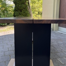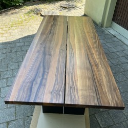 Der moderne Esstisch wurde von einem Schreiner aus regionalem Holz (Region Luzern) gefertigt. Abmessungen in mm: 2050 x 950 x 760. Stärke Tischplatte: 40 mm. Oberflächenbehandlung: geölt. Die massive Tischplatte wird getragen von zwei pulverbeschichteten (Ral. 9005 tiefschwarz, matt glatt) Stahlwangen, welche ebenso von einem Metallbauunternehmen aus der Region Luzern gefertigt wurden. Der Esstisch kann in 5044 Schlossrued besichtigt werden (kh.hunziker@bluewin.ch). Eine Lieferung wäre nach Absprache möglich (gegen Aufpreis).