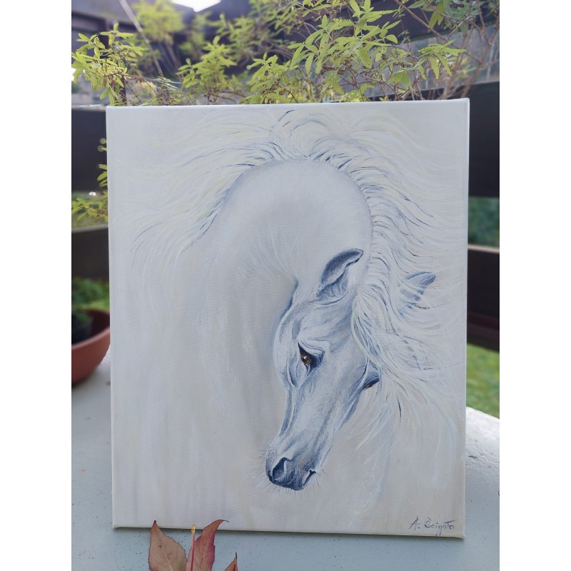 Weisser Pferd Ölgemälde auf Leinwand. Die Ränder sind ebenfalls bemalt. Pebeo-Ölfarben. 50 x 70 cm
